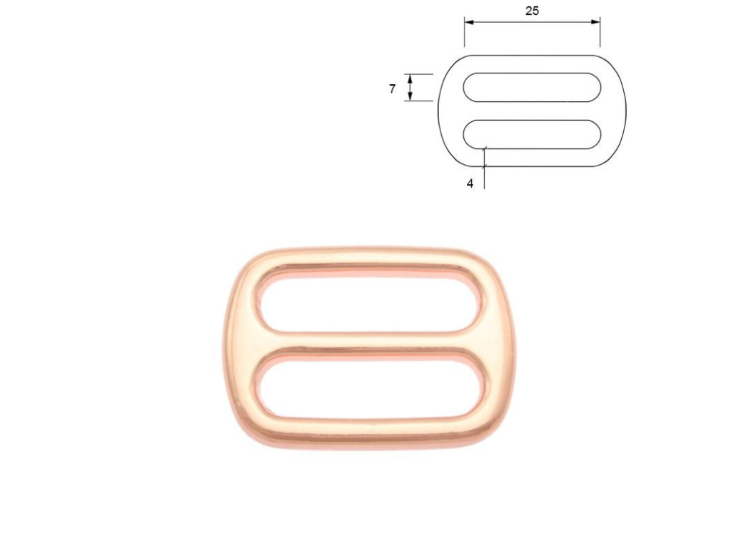Kovová průvlečná spona v barvě růžové zlato, vnitřní šířka 25 mm.