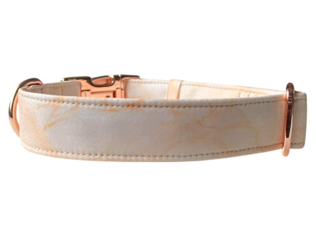 Světle béžový softshellový obojek pro psa ve vzoru Marble Champagne, vel. M (29 - 45 cm), v šířce 2,5 cm, s kovovým trojzubcem a kováním v barvě růžového zlata.