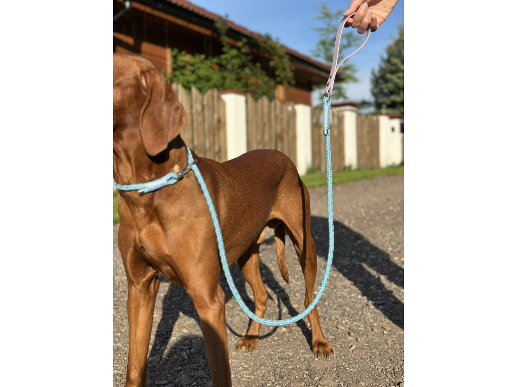 Provazové vodítko pro psa v barvě tyrkys a lila, se světle fialovou rukojetí z voděodolného popruhu BioThane®.