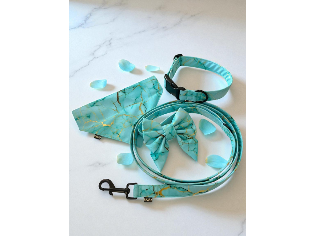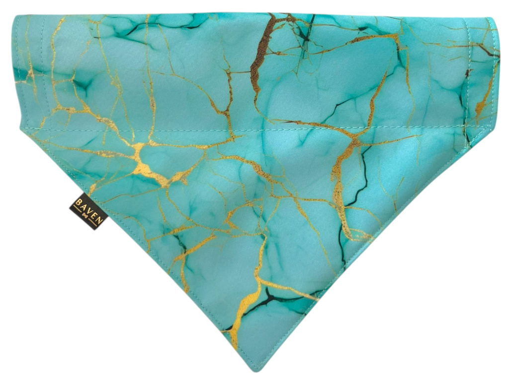 Tyrkysový šátek pro psa se zlatými detaily z kolekce Marble Turquoise, vyrobený ze softshellu. Šátek je ve velikosti M.