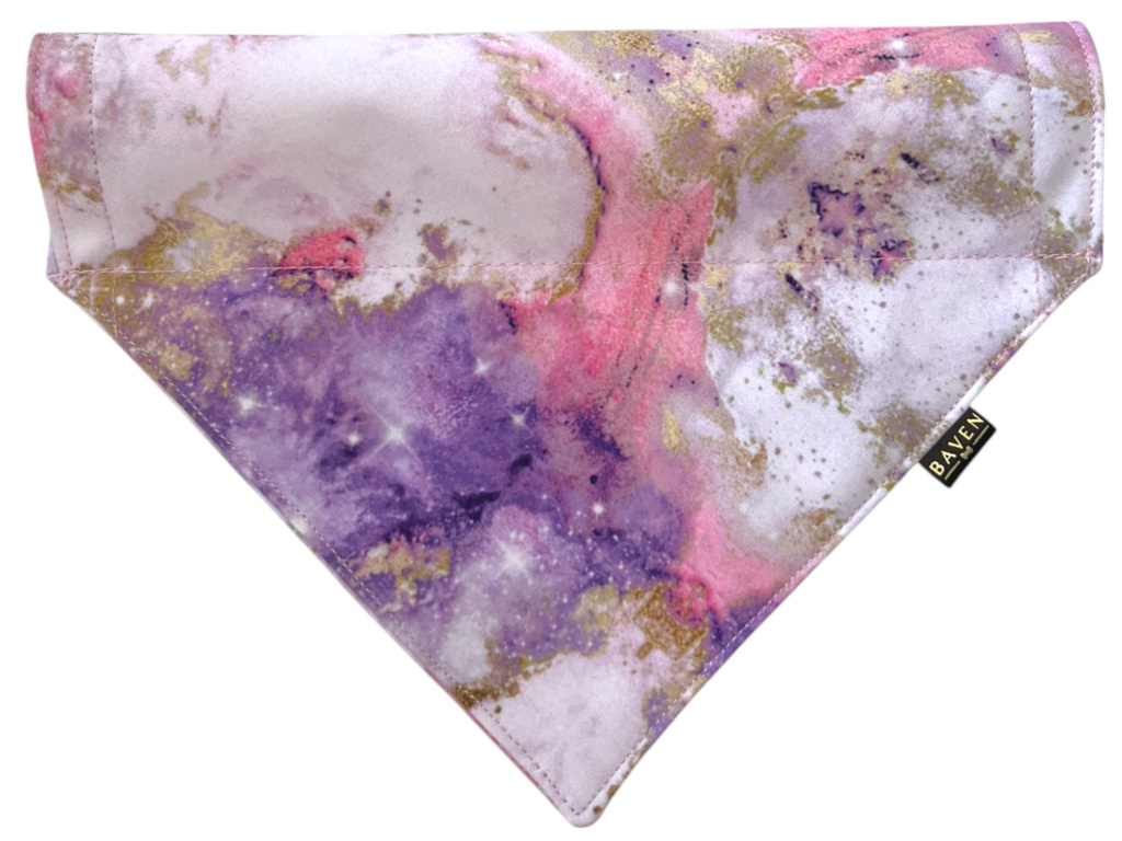 Růžovo-fialový šátek pro psa z kolekce Stardust, vyrobený ze softshellu. Šátek je ve velikosti M.